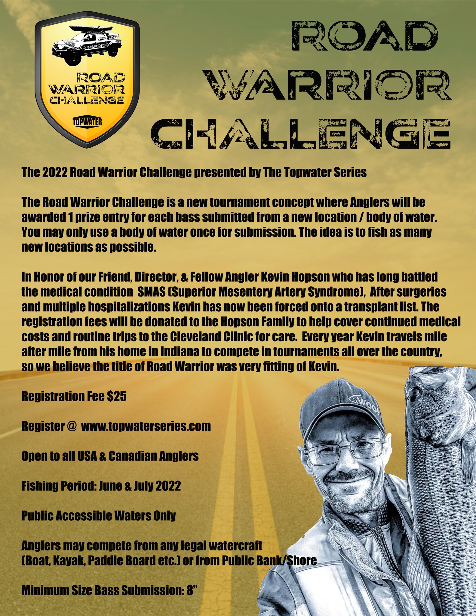Posted in UpdateTagged any style of fishing bass tournament, kayak bass fishing, Michigan bass fishing tournament, North American bass fishing tournament, Road Warrior Bass Fishing Tournament, shore fishing bass tournament, special bass tournament supporting Kevin Hopson, Topwater Nation