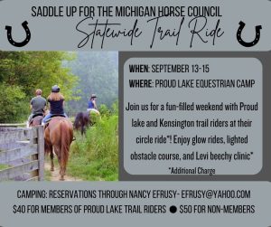 All Outdoors Update Wednesday August 28, 2024 Posted on August 28, 2024August 24, 2024 by jimmishler https://www.alloutdoorsupdate.com/wp-content/uploads/2024/08/All-Outdoors-Update-Wednesday-August-28-2024.mp4 2024Michigan Horse Council State Wide Trail Ride Weekend information and registration Kensinton Trail Riders on Facebook Proud Lake Trail riders on Facebook Image: Michigan Horse Council